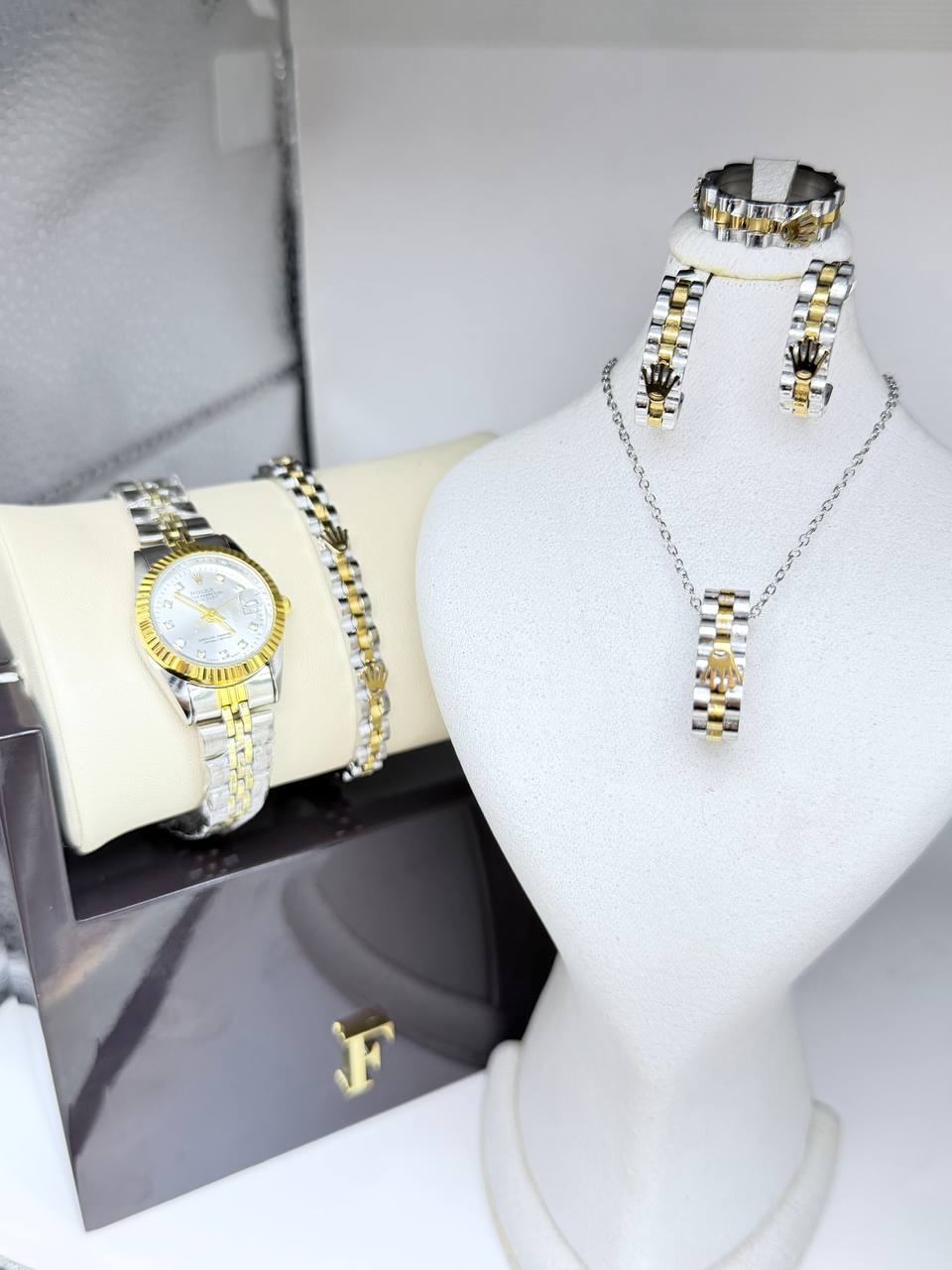 ست ساعت زنانه رولکس تقویم دار طرح دیجاست و تمام ست کامل رولکس تاج دار گردبند و گوشواره و حلقه و دسبند طراحی جدید و خاص
