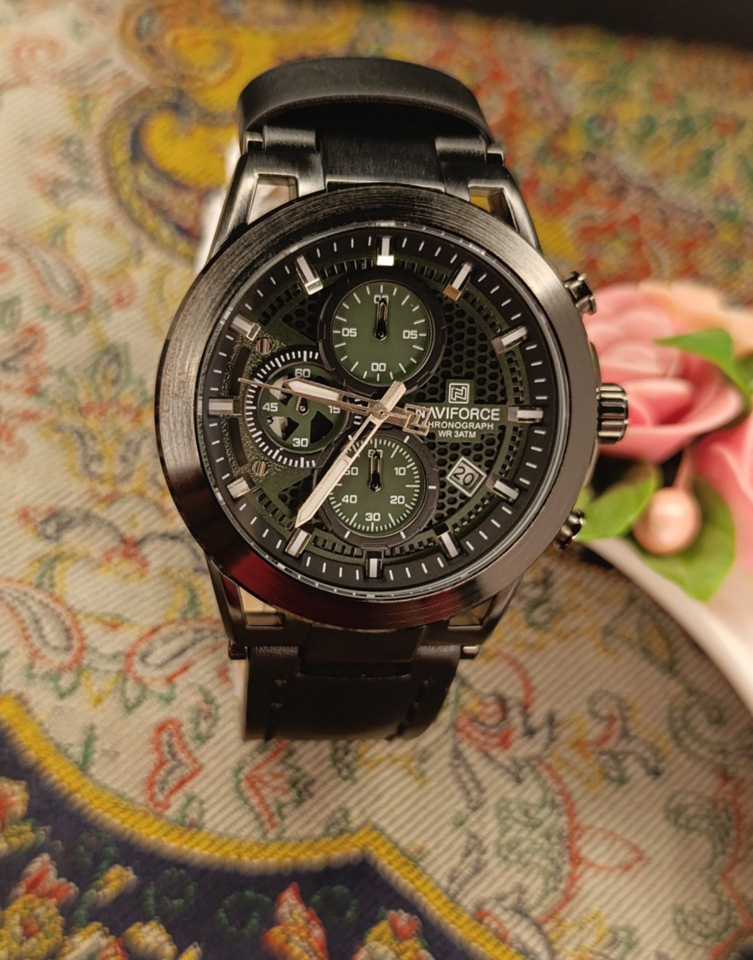 ساعت :مچی ✅برند:نیوی فورس ✅اصالت :اورجینال شرکتی ✅جنسیت :مردانه ✅مقاومت در برابر آب: (در حد پاشش آب ) ✅فرم صفحه :گرد ✅جنس بدنه :آلیاژ روی ✅جنس شیشه :معدنی مقاوم در برابر خش ✅جنس بند:چرم ✅نوع قفل بند:سگکی ساده ✅اندازه قاب:43 میلی متر ✅وزن:105 گرم ✅بند :چرم ✅رنگ صفحه: سبز ✅تکنولوژی ساخت :کوارتز ✅منبع انرژی: باتری ✅نوع موتور:سه موتور عقربه ای ✅عقربه های شب تاب :دارد ✅ویژگی ها ✅سه موتوره, ,, عقربه های شب تاب, ,, ✅کرونوگراف, ,, نشانگر تاریخ