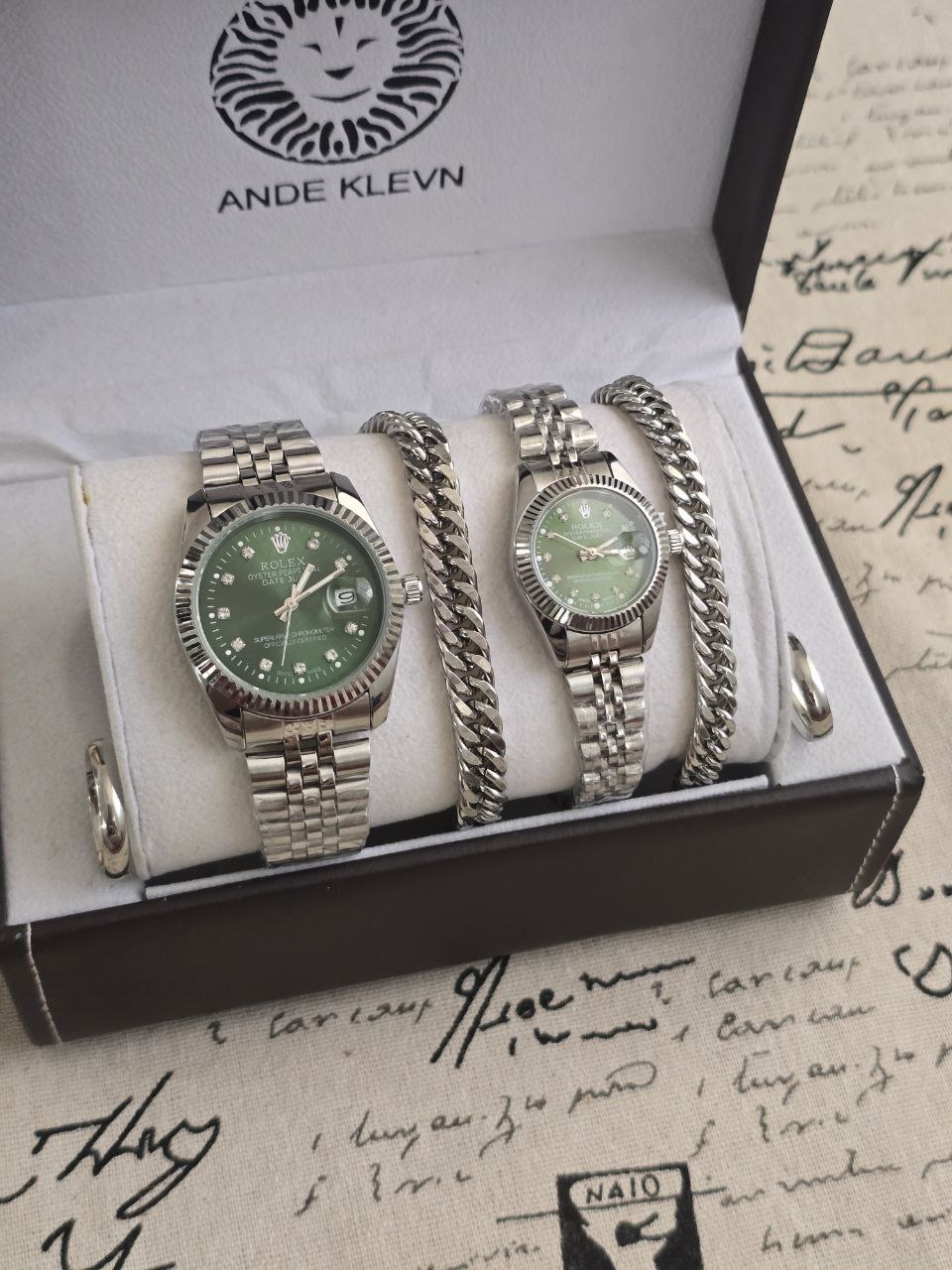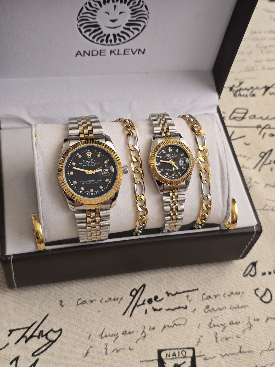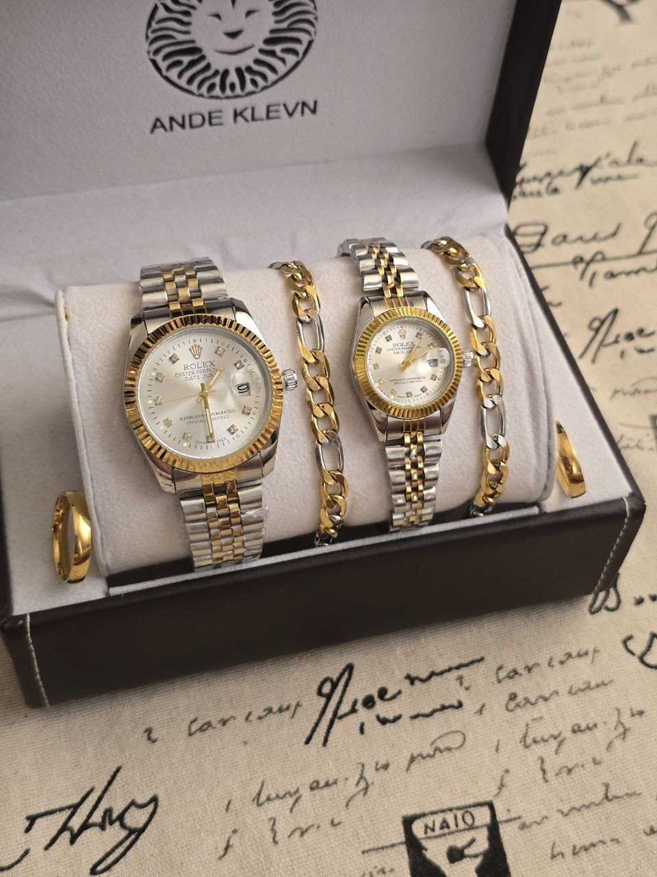 ست ساعت زنانه و مردانه😍⌚️ برند رولکس ساعت ها دارای روزشمار دو عدد دستبند کارتیر استیل و دو تا انگشتر