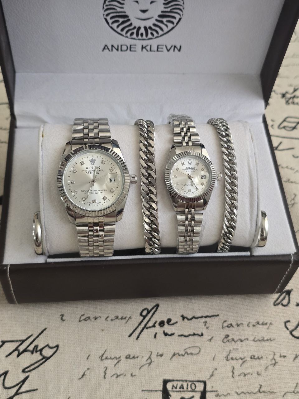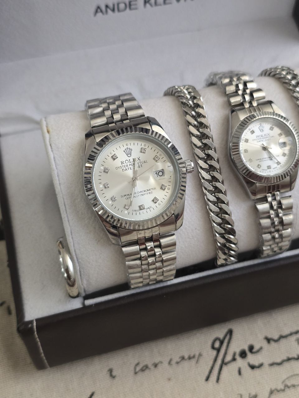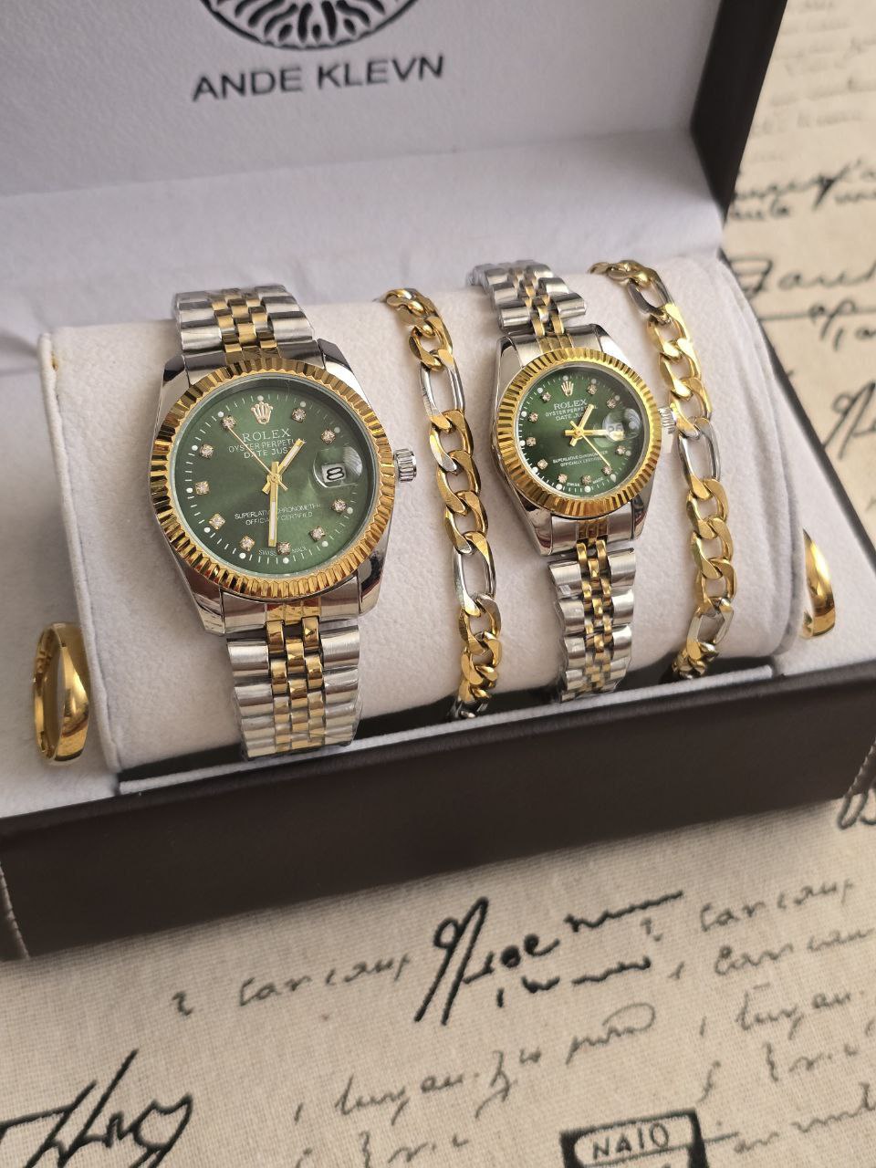 ست ساعت زنانه و مردانه😍⌚️ برند رولکس ساعت ها دارای روزشمار دو عدد دستبند کارتیر استیل و دو تا انگشتر