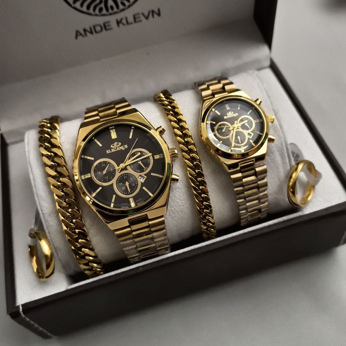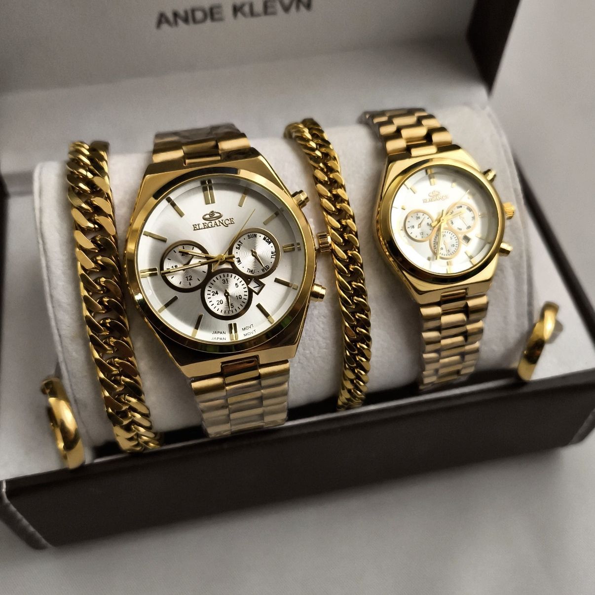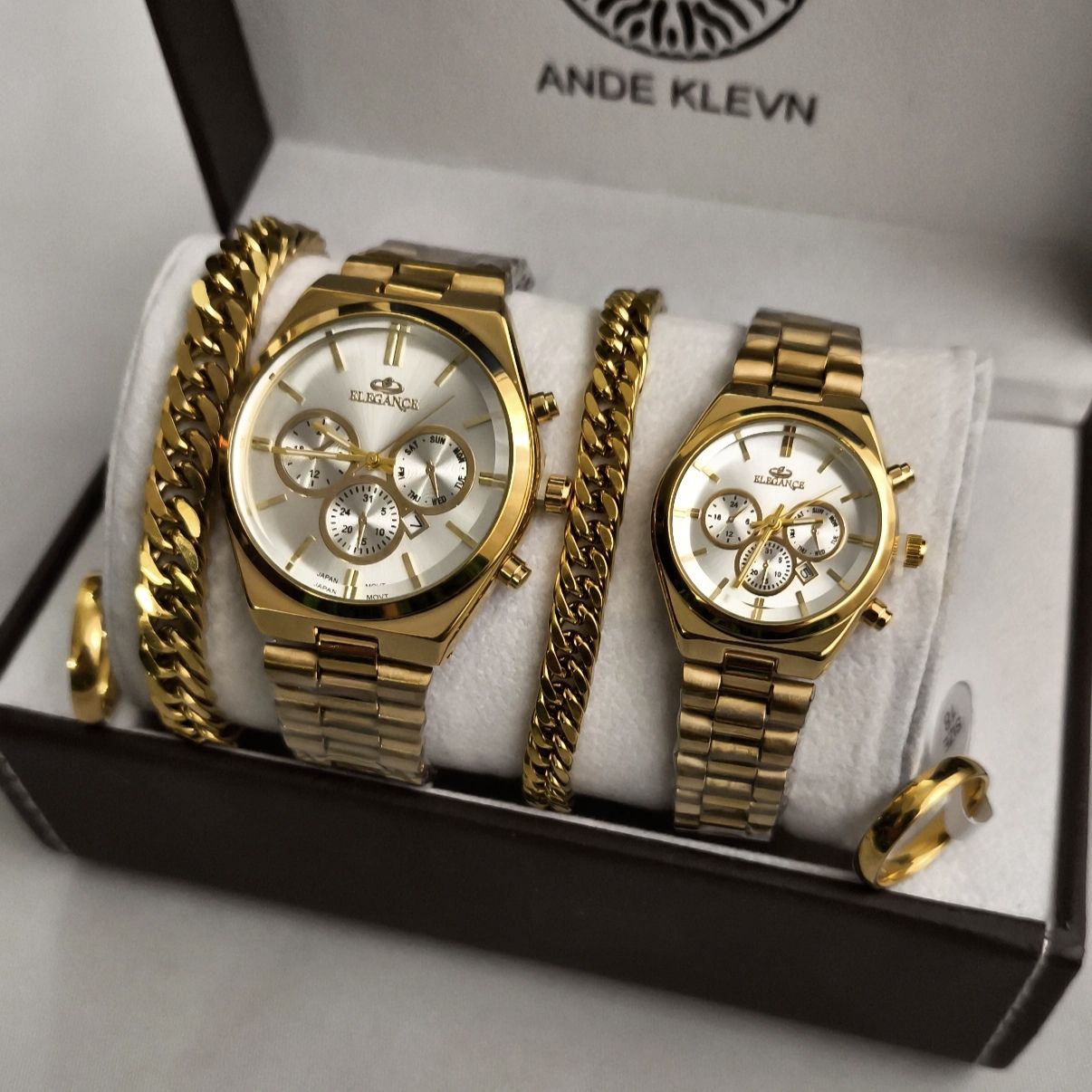 ست ساعت زنانه و مردانه  برند الگانس بند استیل ساعت ها دارای روزشمار دو عدد  دستبند و حلقه به همراه جعبه کادویی