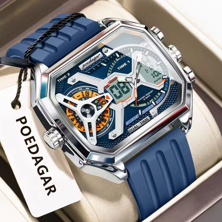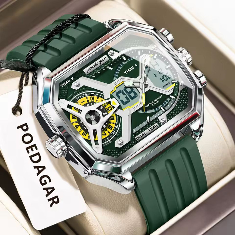 ساعت مچی مردانه برند پوداگار 🔰 مردانه 🔰 سه زمانه فعال 🔰 رنگ ثابت 🔰 ضدآب3Atm 🔰 روز شمار دار , ایام هفته ، نمایش سال 🔰 کرنومتر،آلارم،بک لایت و.... 🔰 قطر 47 میلی متر 🔰 قفل سگکی 🔰 قاب استیل 🔰 بند سیلیکونی 🔰 باکس اصلی