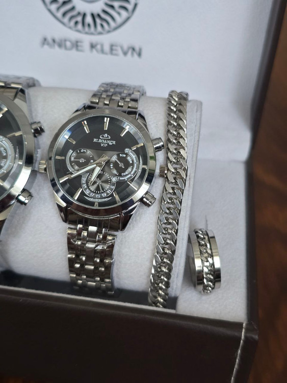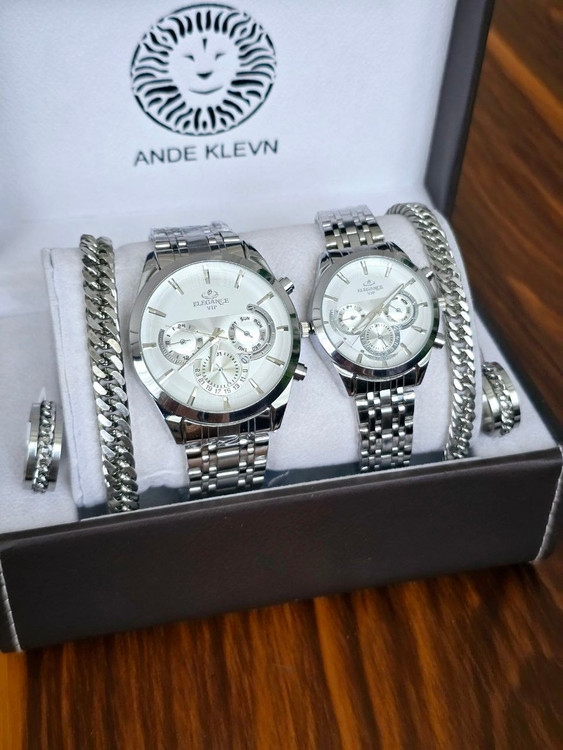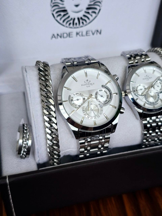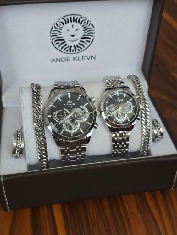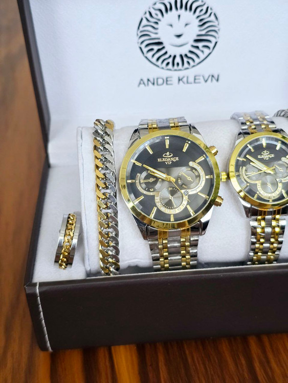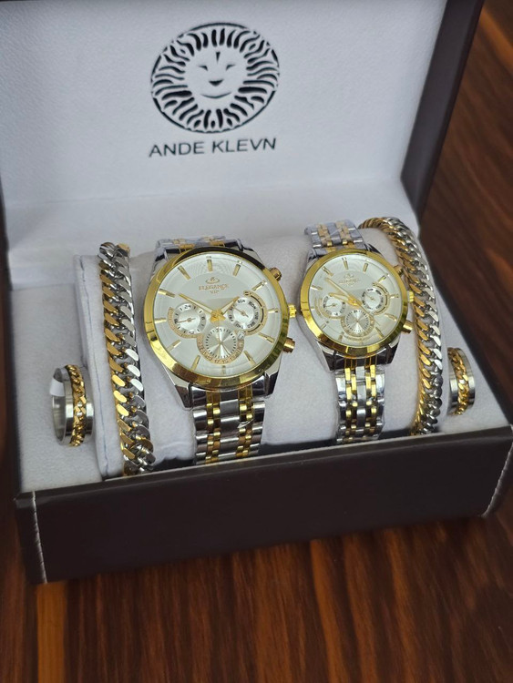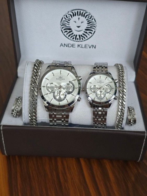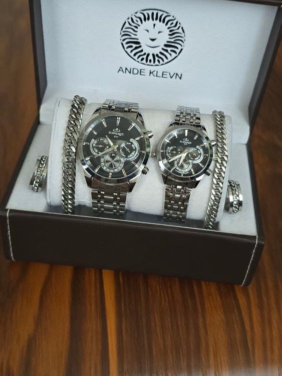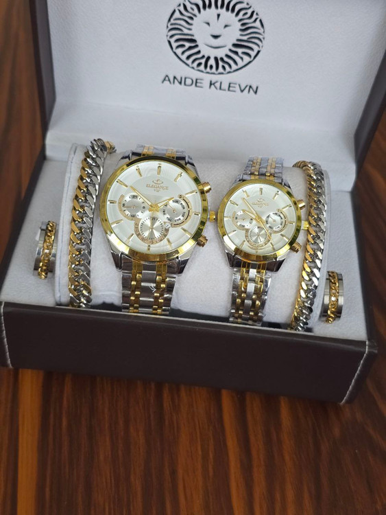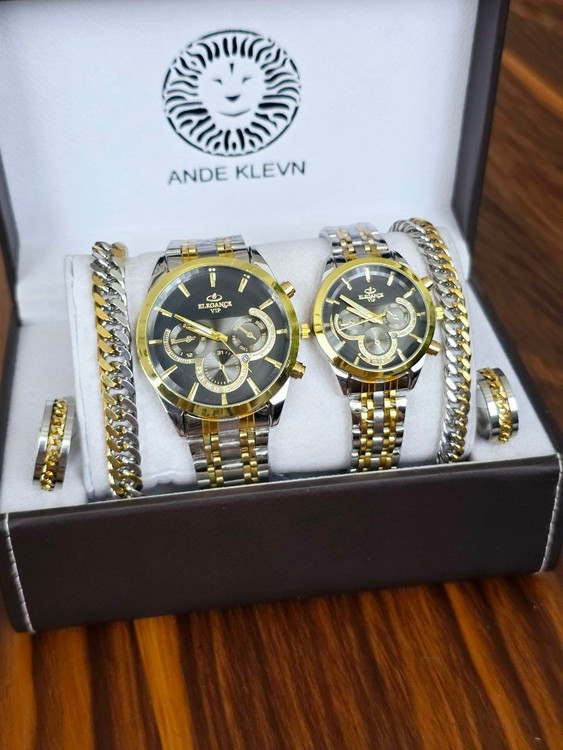 ست ساعت زنانه و مردانه برند الگانس (Elegance) با طراحی لوکس و چشمنواز، ترکیبی از رنگ طلایی و نقرهای را به نمایش میگذارد که جلوهای شیک و هماهنگ دارد. صفحهنمایش مشکی با عقربهها و نشانگرهای طلایی، جلوهای مجلل و حرفهای ایجاد کرده است. این ست زیبا همراه با دستبندهای همرنگ و انگشترهای ست، گزینهای بینظیر برای زوجهایی است که به استایل هماهنگ و خاص اهمیت میدهند. بستهبندی شکیل این محصول آن را برای هدیه دادن نیز بسیار مناسب کرده است