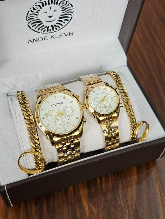 ست ساعت زنانه و مردانه برند الگانس (Elegance) با طراحی لوکس و چشمنواز، ترکیبی از رنگ طلایی و نقرهای را به نمایش میگذارد که جلوهای شیک و هماهنگ دارد. صفحهنمایش مشکی با عقربهها و نشانگرهای طلایی، جلوهای مجلل و حرفهای ایجاد کرده است. این ست زیبا همراه با دستبندهای همرنگ و انگشترهای ست، گزینهای بینظیر برای زوجهایی است که به استایل هماهنگ و خاص اهمیت میدهند. بستهبندی شکیل این محصول آن را برای هدیه دادن نیز بسیار مناسب کرده است