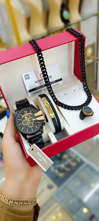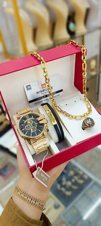 دارای: ساعت و دستبند وگردنبند وانگشتر طلاروس