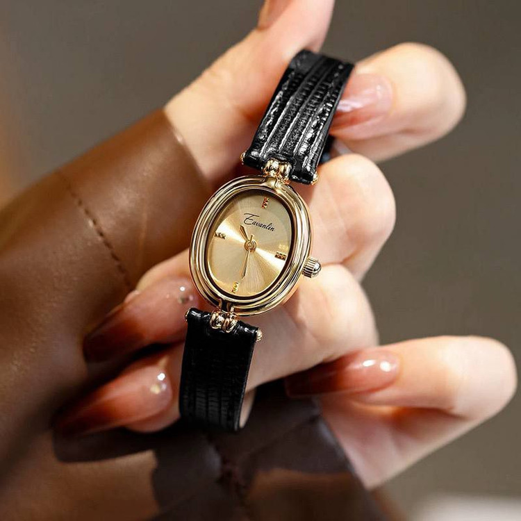 موتور میوتا ژاپن(زیر مجموعه سیتیزن) در دو رنگ مشکی و قهوه ای بند چرمی باکیفیت قفل سگکی موومنت کوارتز ضد اب شست و شوی دست صفحه طلایی قاب طلایی رنگ ثابت قطر صفحه ۲۵ میل عرض بند ۱۵ میل صفحه بیضی