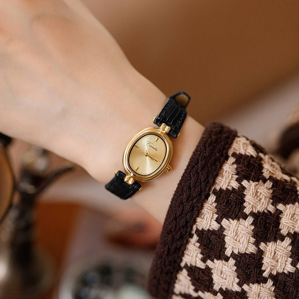 اطلاعات محصول :: موتور میوتا ژاپن(زیر مجموعه سیتیزن) در دو رنگ مشکی و قهوه ای بند چرمی باکیفیت قفل سگکی موومنت کوارتز ضد اب شست و شوی دست صفحه طلایی قاب طلایی رنگ ثابت قطر صفحه ۲۵ میل عرض بند ۱۵ میل صفحه بیضی
