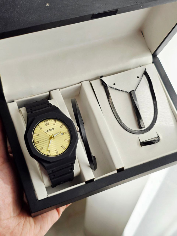 ست مردانه ساعت و بنگل و گردنبند و حلقه بهمراه جعبه کادویی و باتری