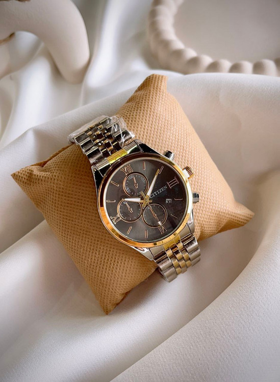 ELEGANCE CITIZEN ROMANSON برای خانمها موتور کوارتز ضدآب قفل کلیپسی بنداستیل رنگ ثابت قاب استیل طرح سه موتور دارای روز شمار بند اجری کد 000440498 به همراه جعبه هدیه و باتری یدک