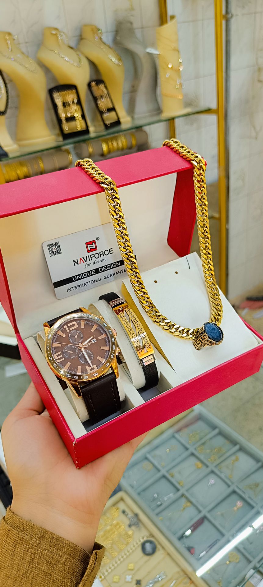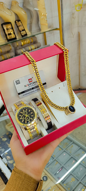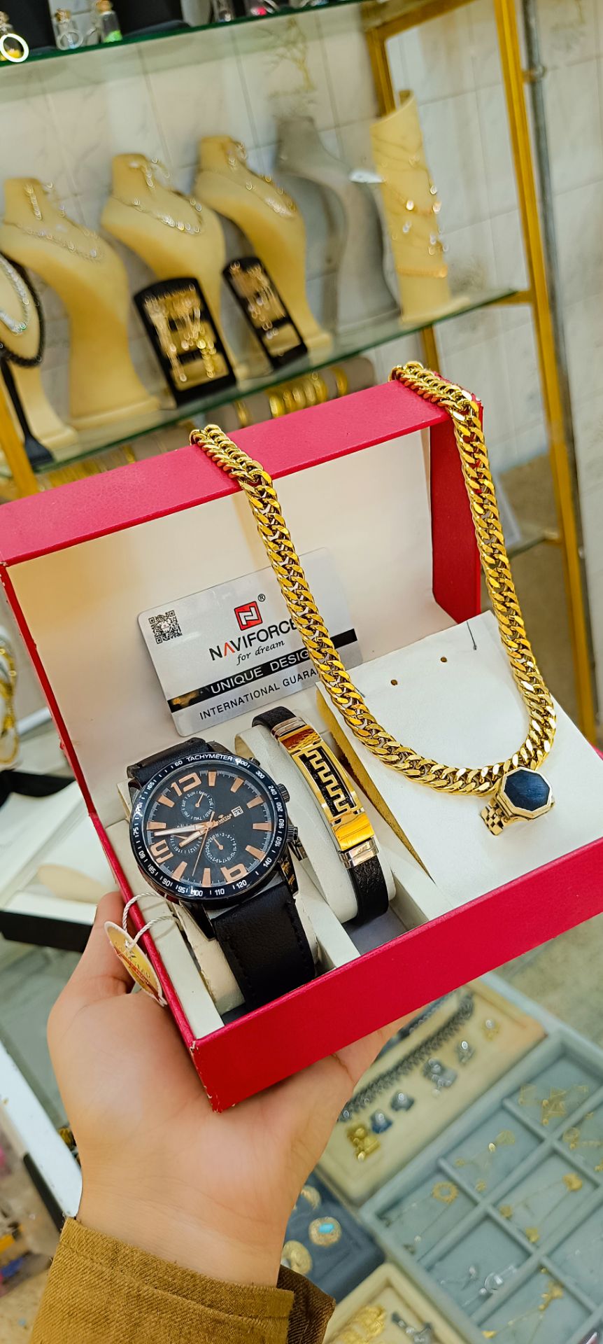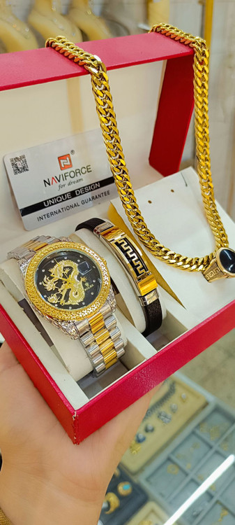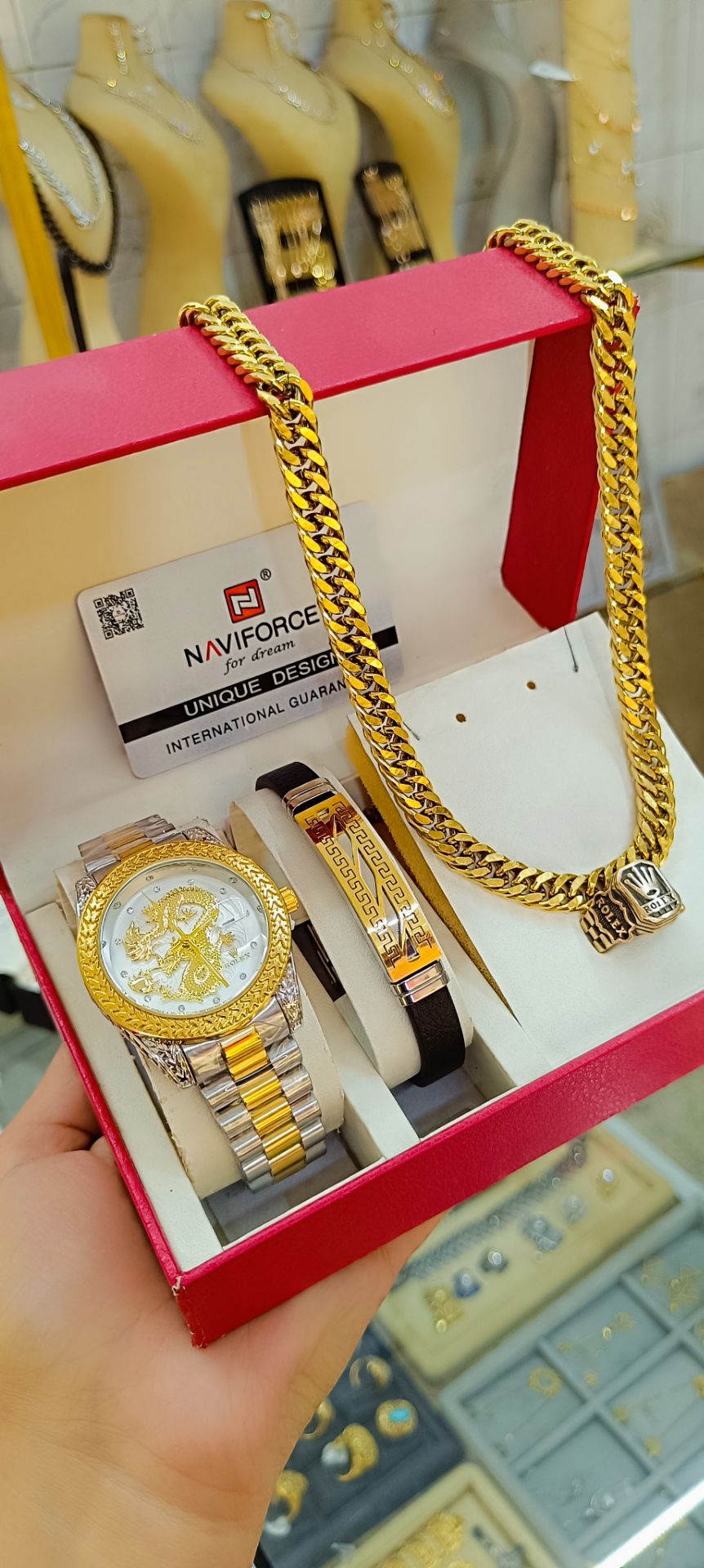 مشخصات: 😍🍁کالکشن بسیار جذاب مردانه و فوقالعاده زیبا ✅ساعت دراگون کیفیت عالی تاریخدار اصلی ✅همراه دستبند چرم ✅ گردنبند استیل ✅انگشتر طلا روس مردانه