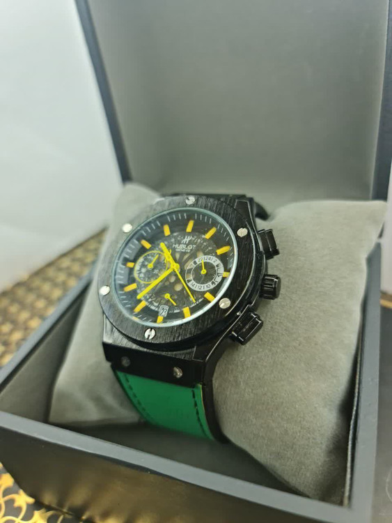 مشخصات: HUBLOT ♾ هابلو کرنوگراف مناسب آقایان قفل کلیپسی هابلو ضدآب دارای روز شمار بند رابر با روکش چرم قاب