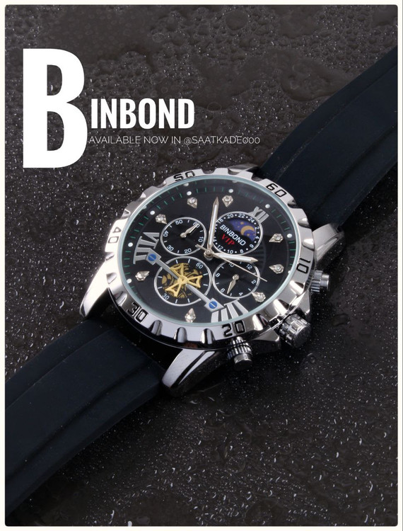 (بدون تغییر قیمت) Binbond Univrrse For Men برای آقایان موتور شرکتی A++ ۳ موتور فعال کرنوگراف دارای روزشمار دارای moonphase بند PU ضدحساسیت قفل استیل کلیپسی شیشه کریستال ضدخش ضدآب 3Atm ❌۳۰