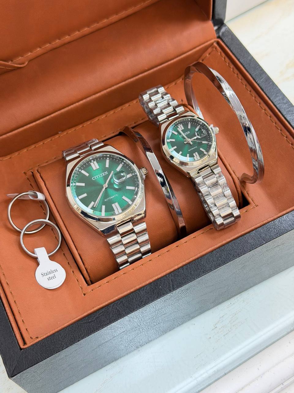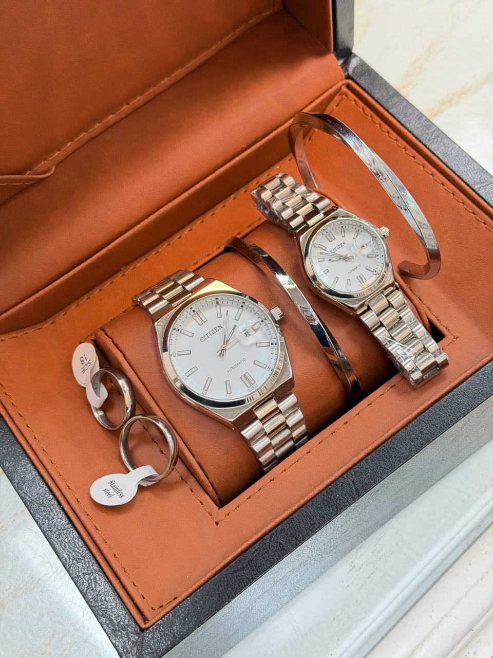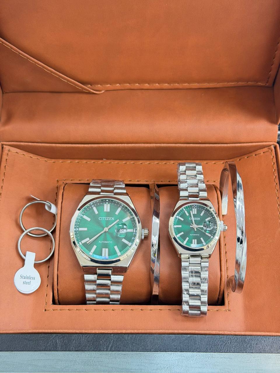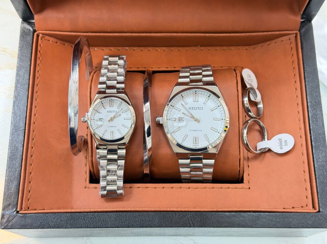 ست ساعت زنانه و مردانه سیتیزن ست طرح اکودرایو تقویم دار تقویم ذره بینی قفل فشاری ضامن دار همراه دسبند و حلقه ست ( با هر دو مدل دسبند و حلقه قابل ثبت سفارش)